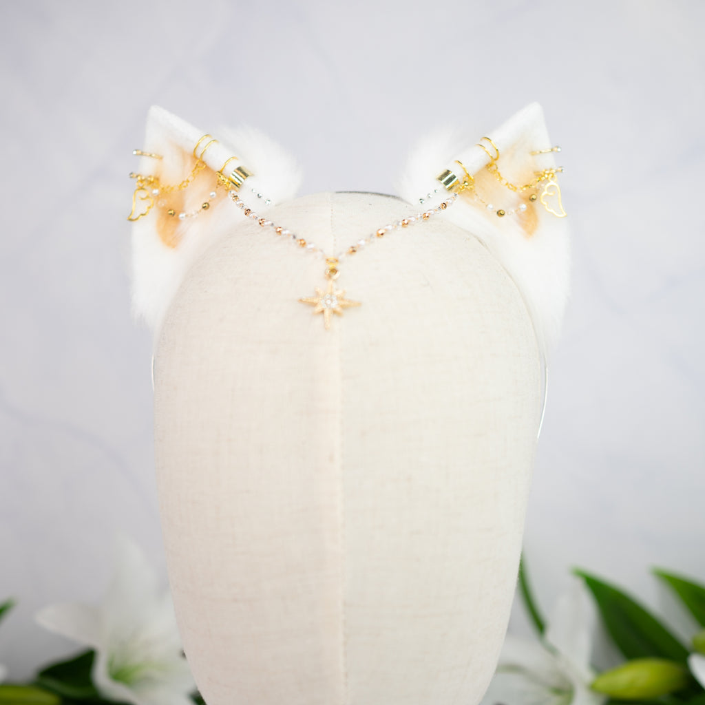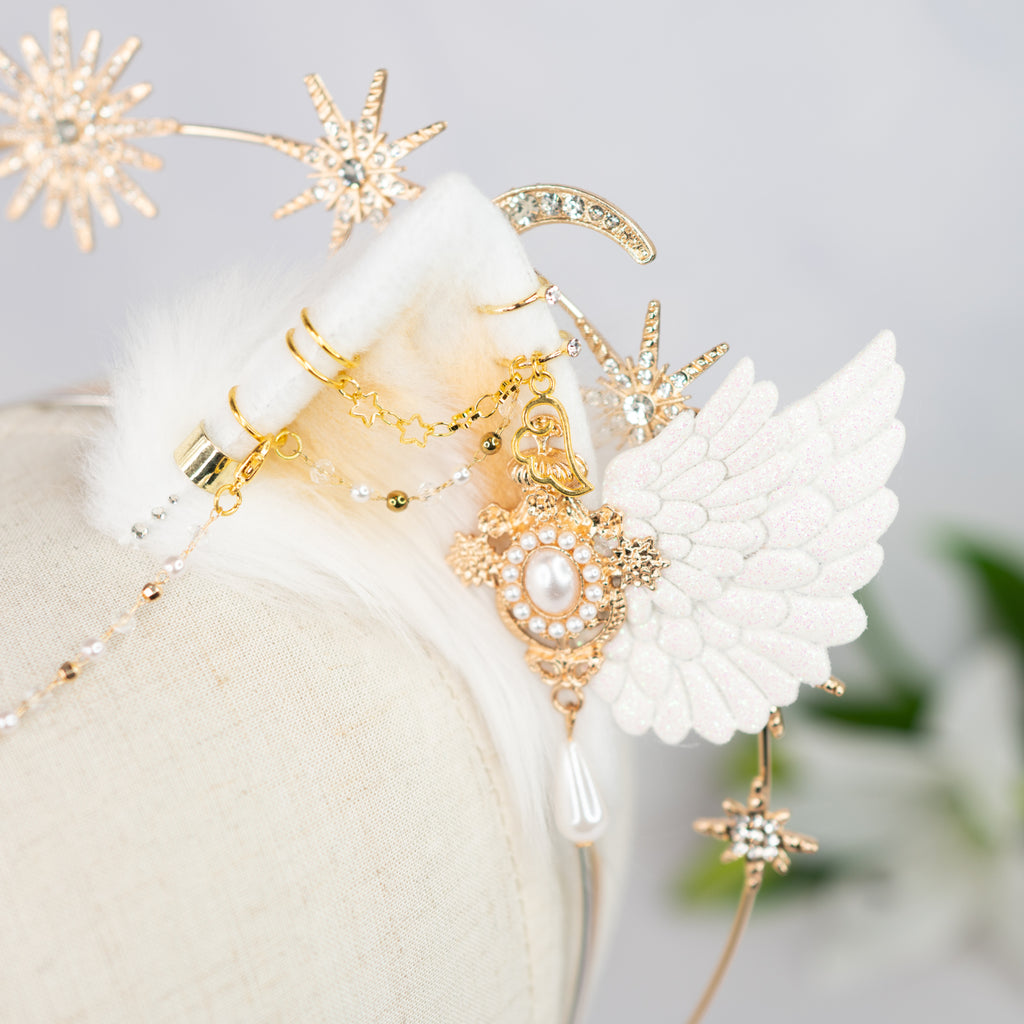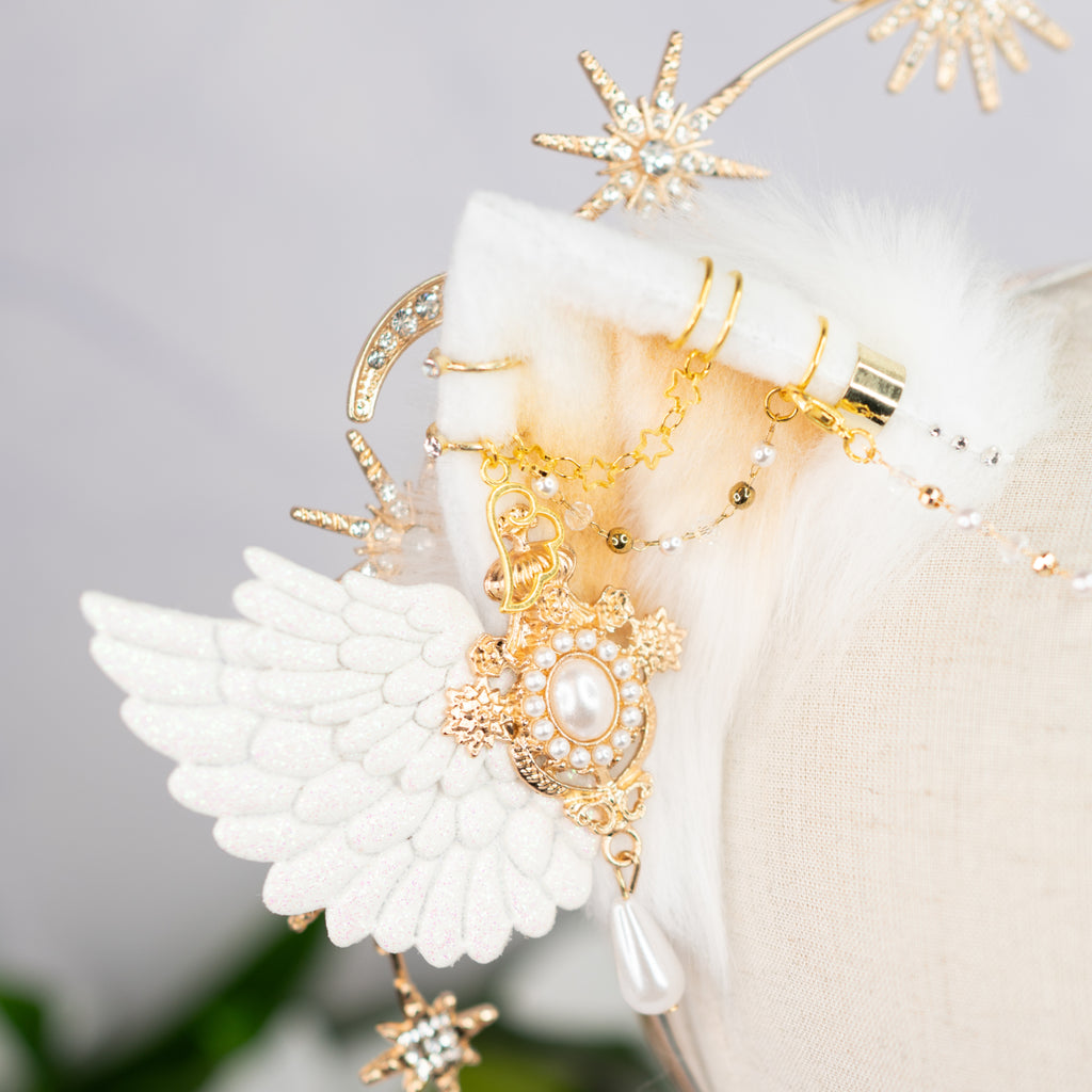 What is offered: A thin metal headband with a pair of faux fur kitten ears in the color white/gold with gold piercings and chains, a removable forehead chain, removable wing clips and a gold halo headband