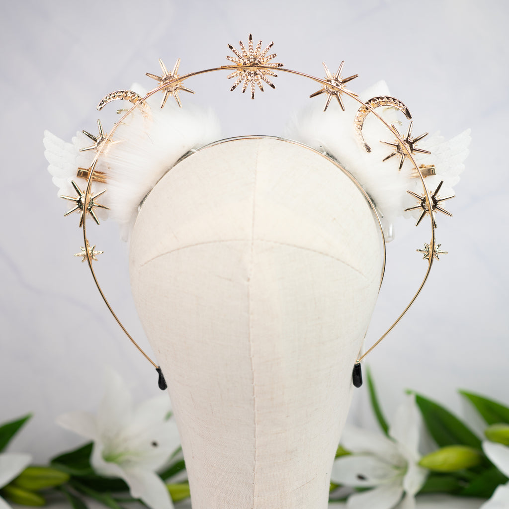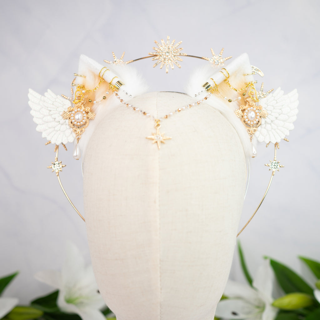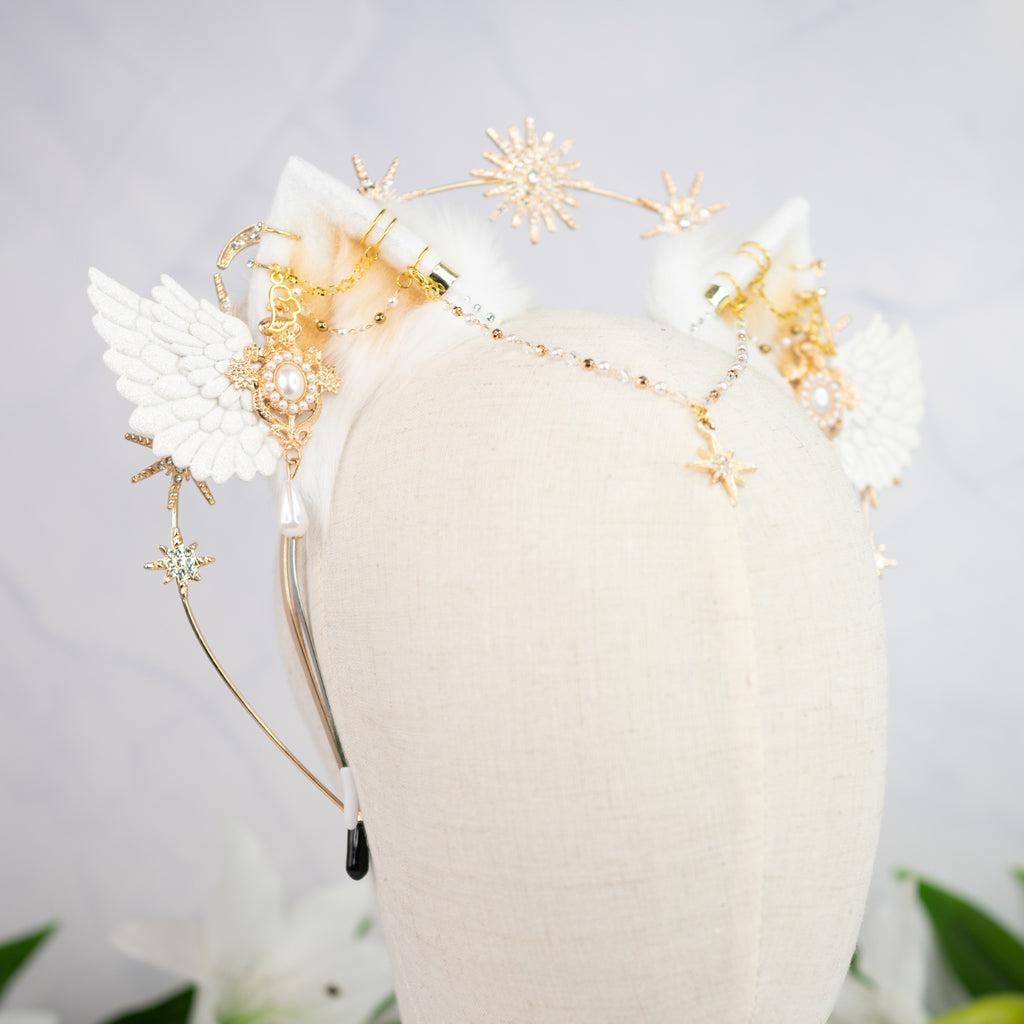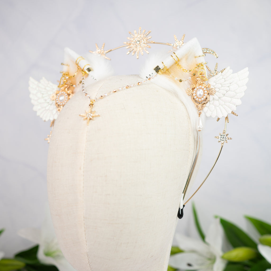 What is offered: A thin metal headband with a pair of faux fur kitten ears in the color white/gold with gold piercings and chains, a removable forehead chain, removable wing clips and a gold halo headband