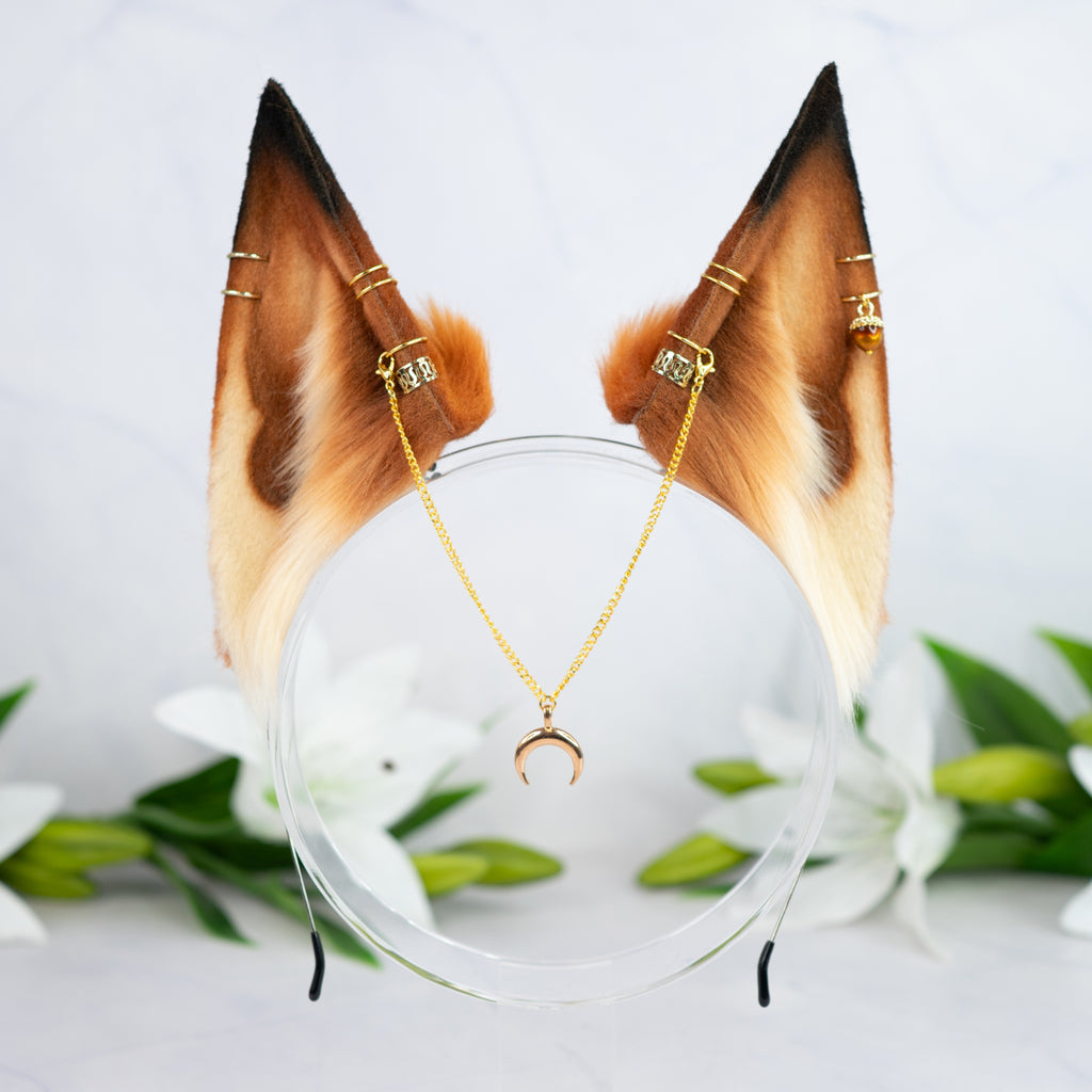 What is offered: A thin metal headband with a pair of faux fur fox ears in the color copper brown/blonde/black with gold piercings, a removable forehead chain and removable autumn clips