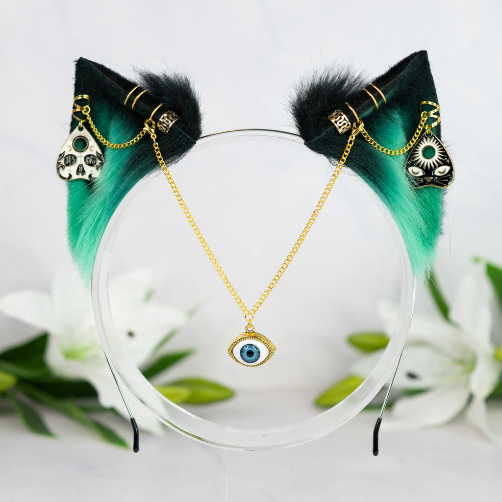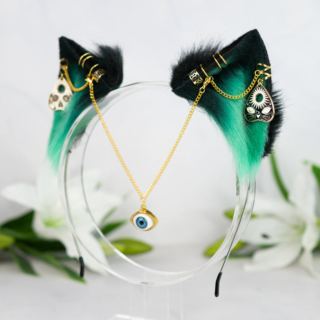 What is offered: A thin metal headband with a pair of faux fur kitten ears in the color green/black with gold piercings and chains and a removable forehead chain