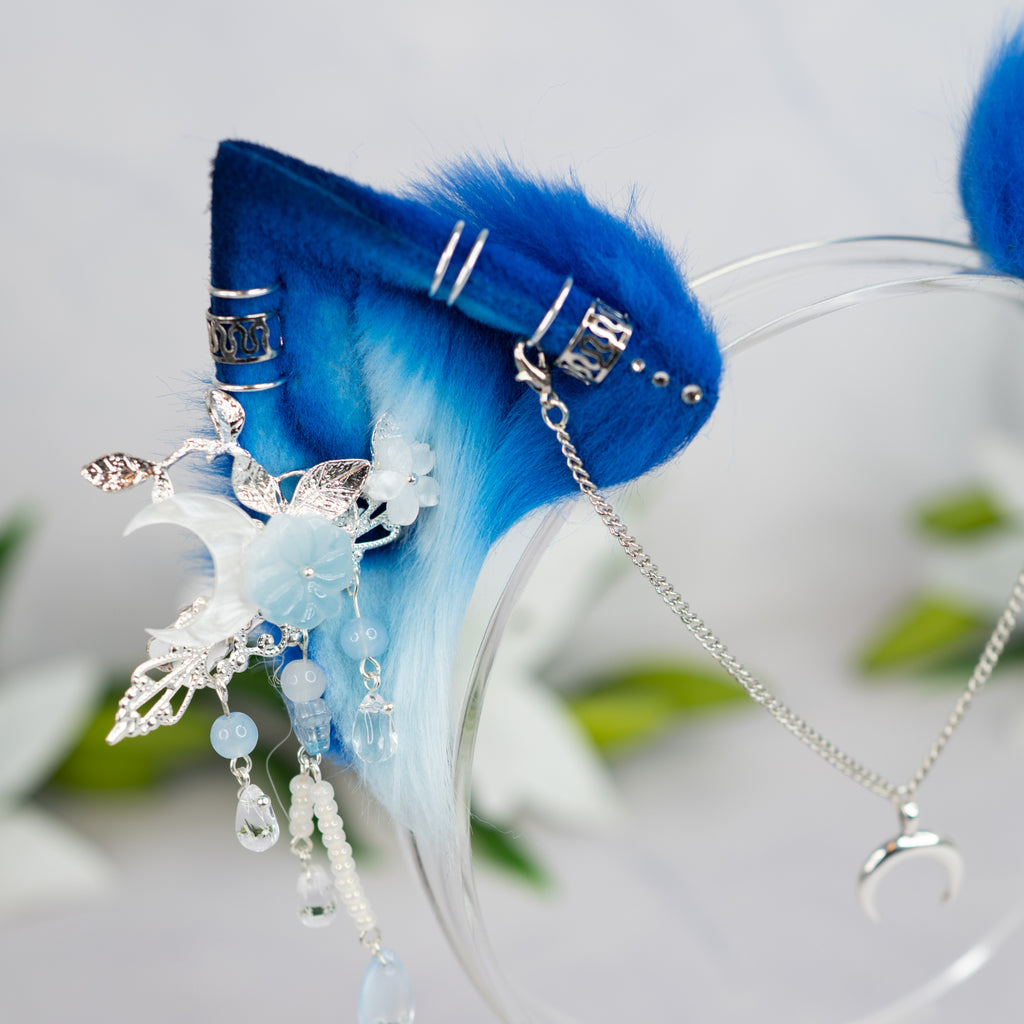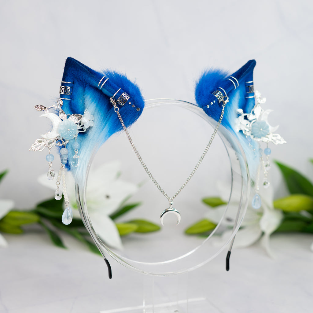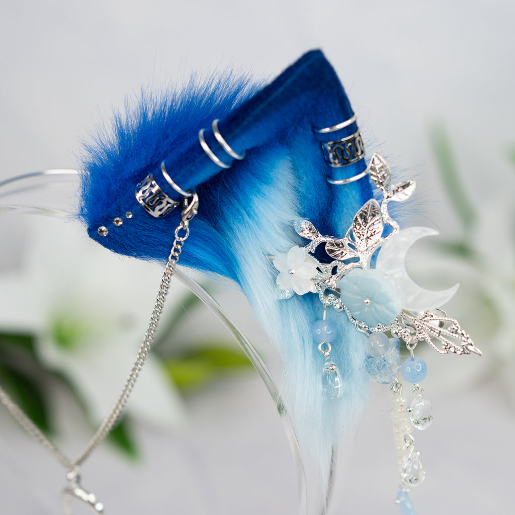 What is offered: A thin metal headband with a pair of faux fur kitten ears in the color blue with silver piercings, a removable forehead chain and removable clip accessories