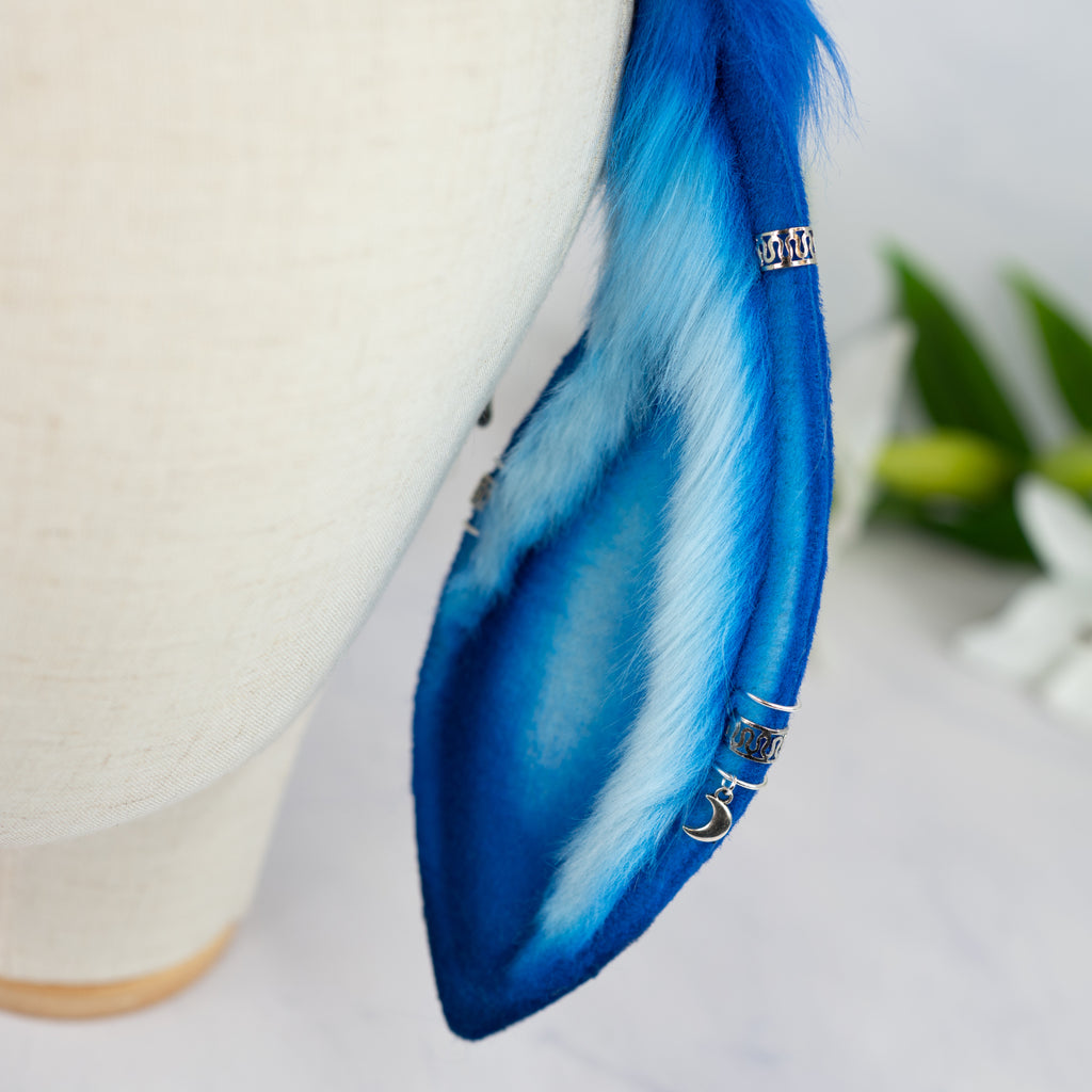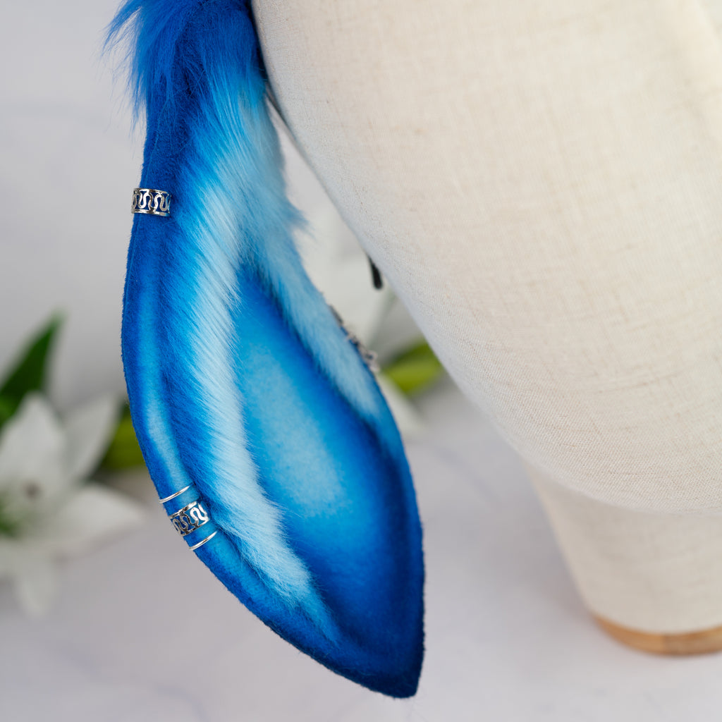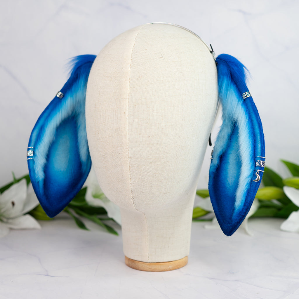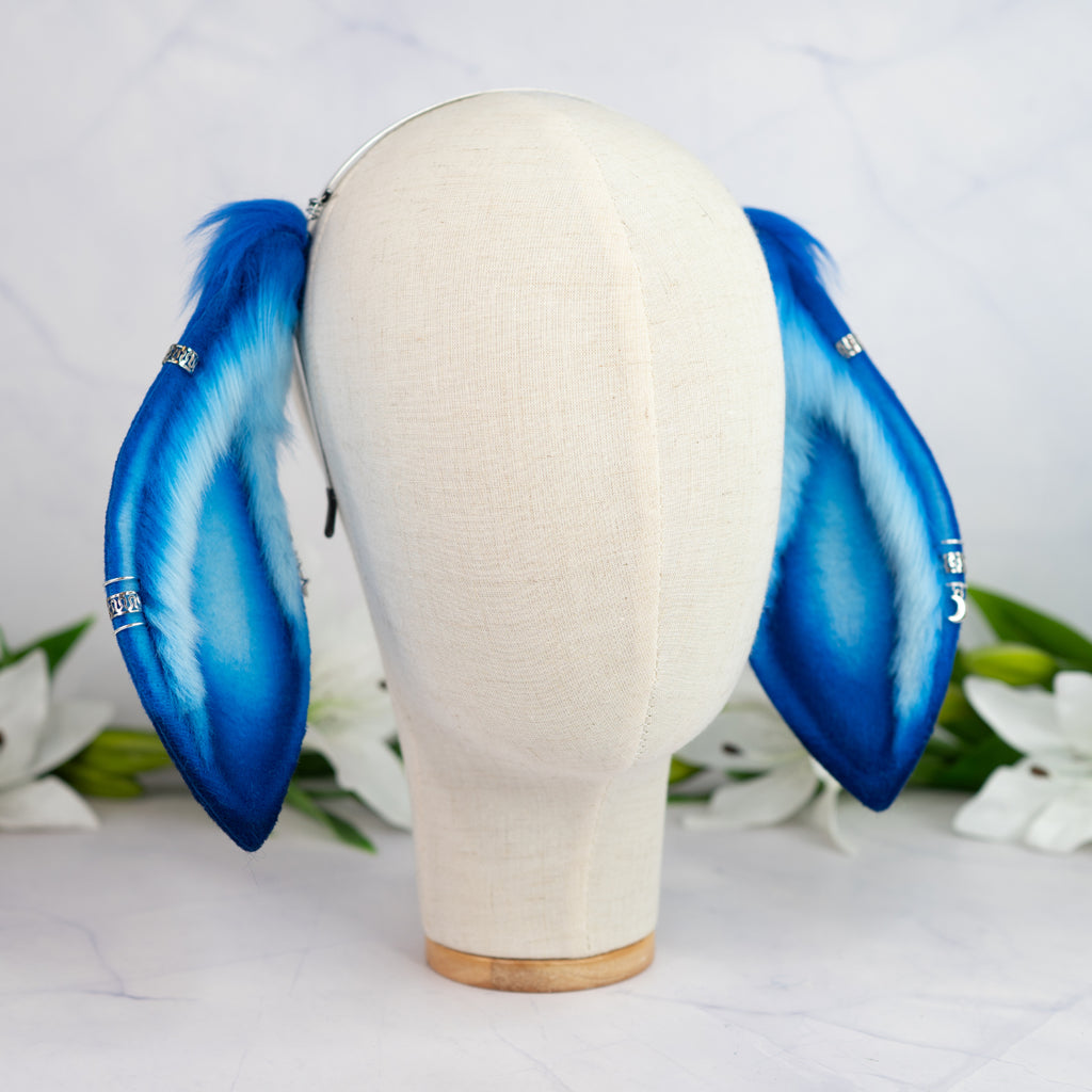 What is offered: A thin metal headband with a pair of faux fur lop bunny ears in the color blue with silver piercings, a removable forehead chain and removable clip accessories