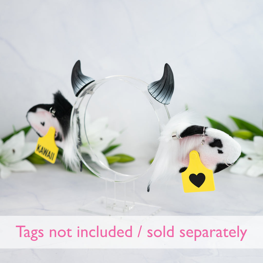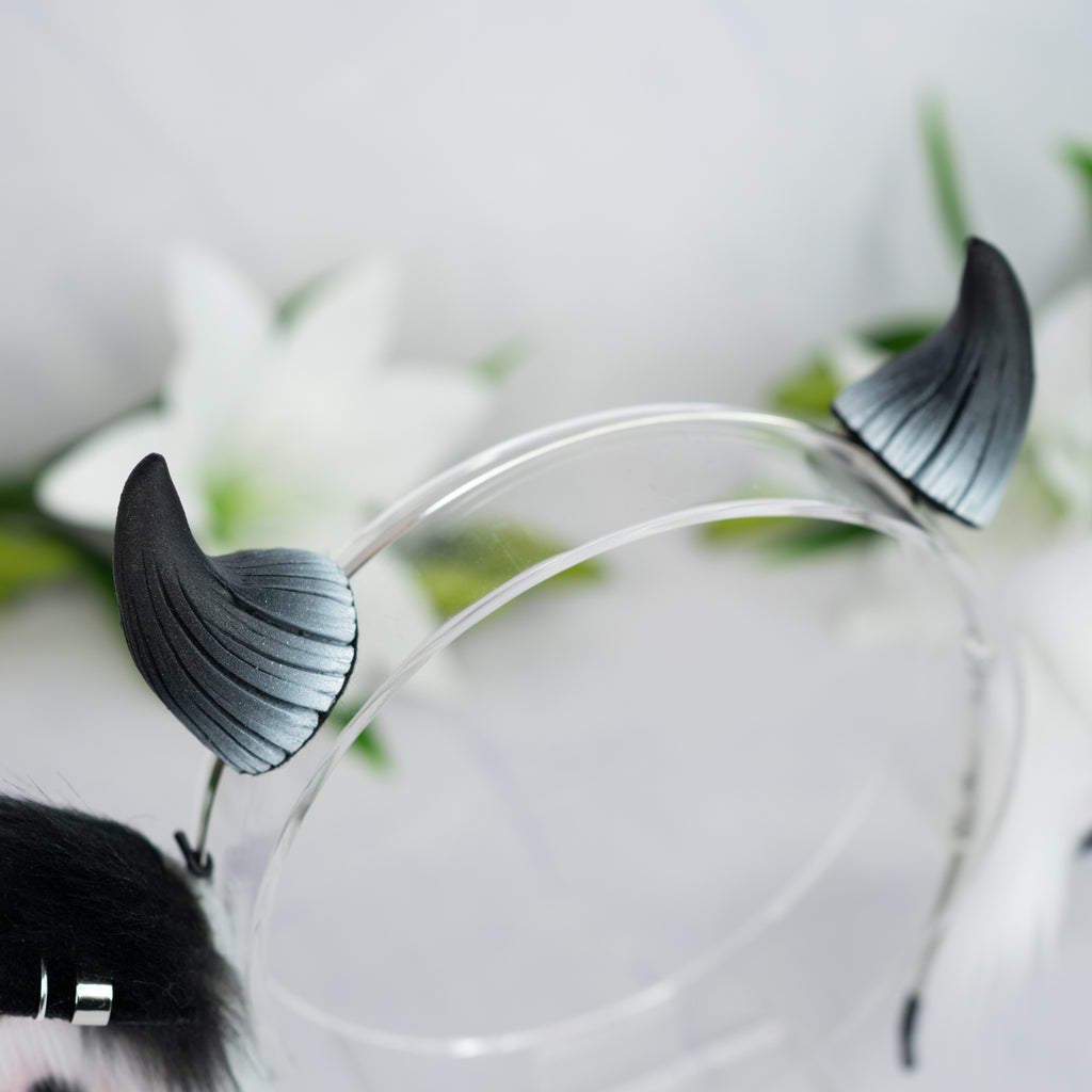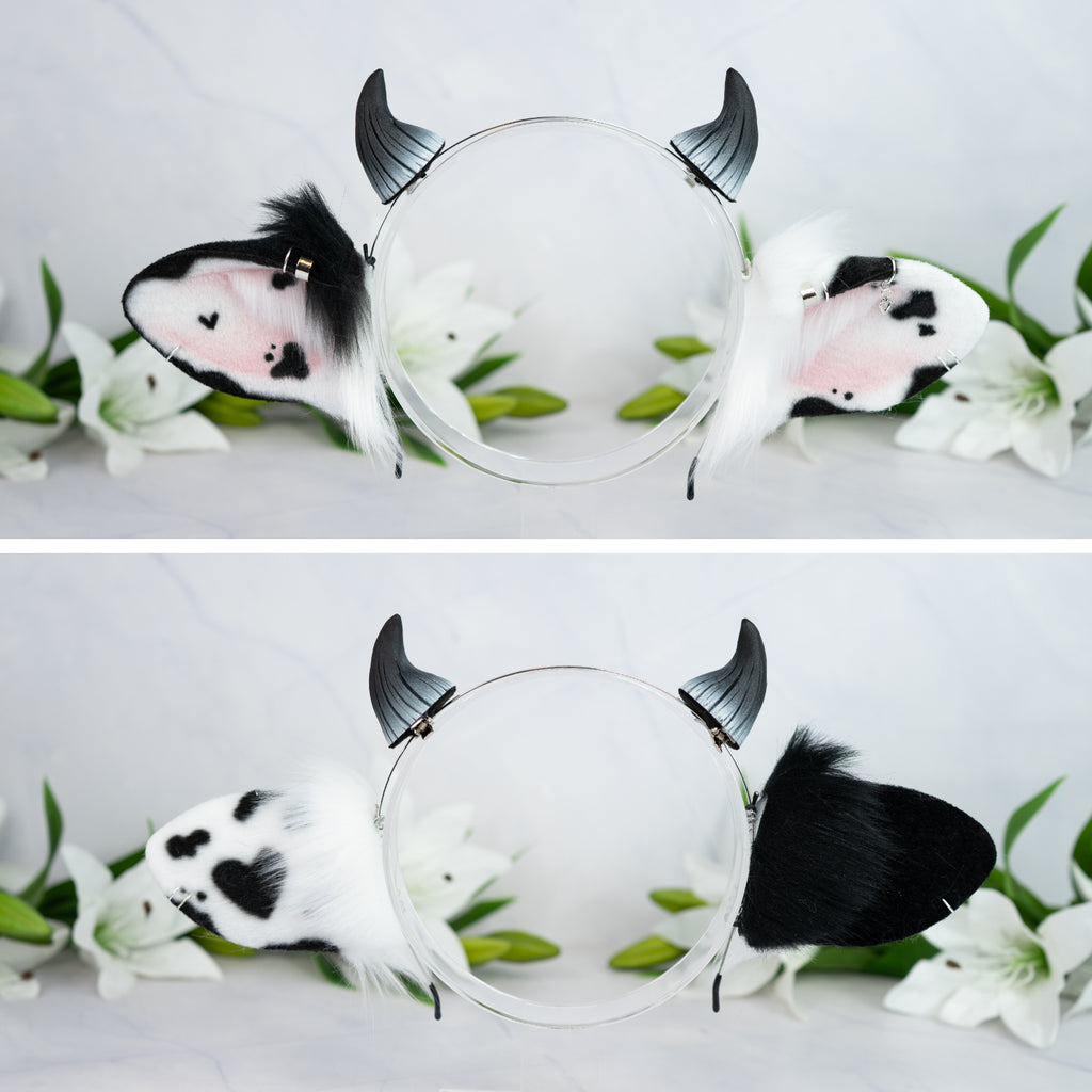 What is offered: A thin metal headband with a pair of faux fur cow ears in the color white/black and silver piercings and small horns on clips