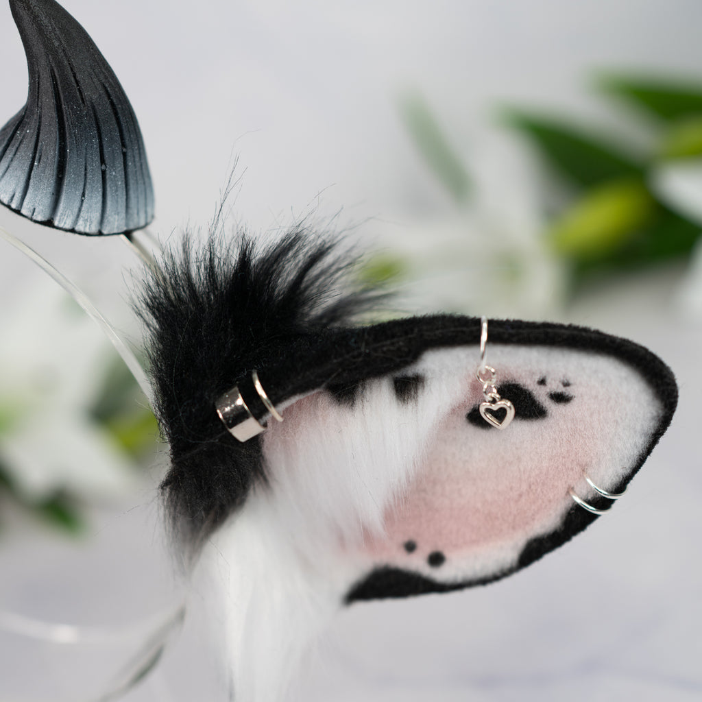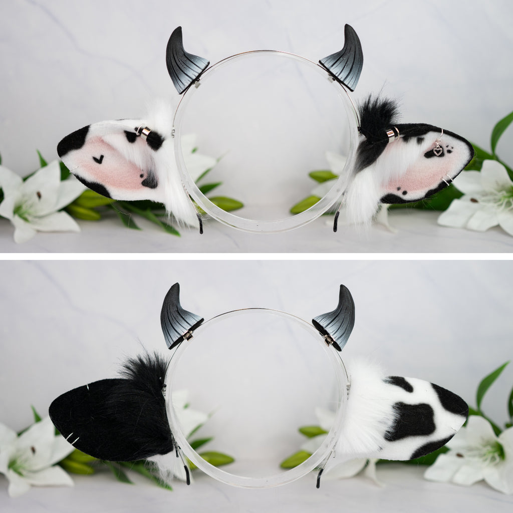 What is offered: A thin metal headband with a pair of faux fur cow ears in the color white/black and silver piercings and small horns on clips