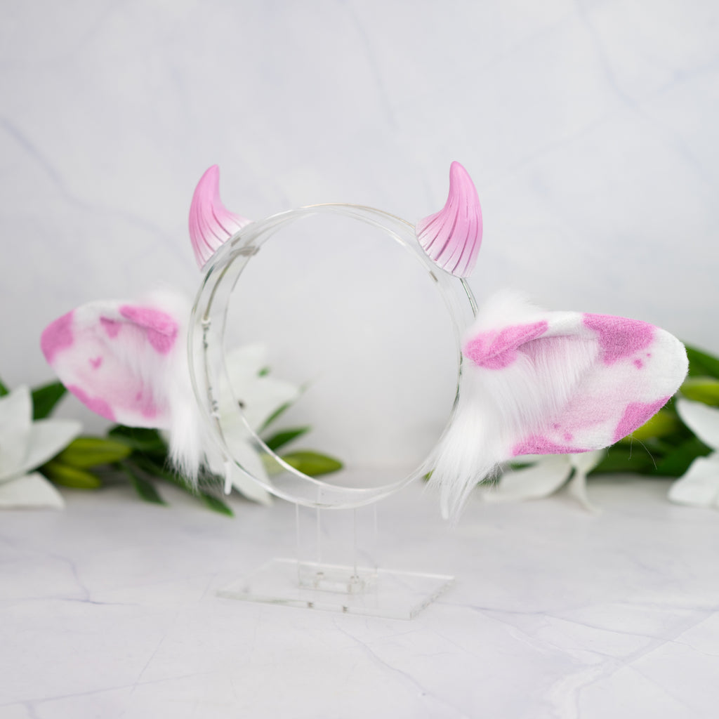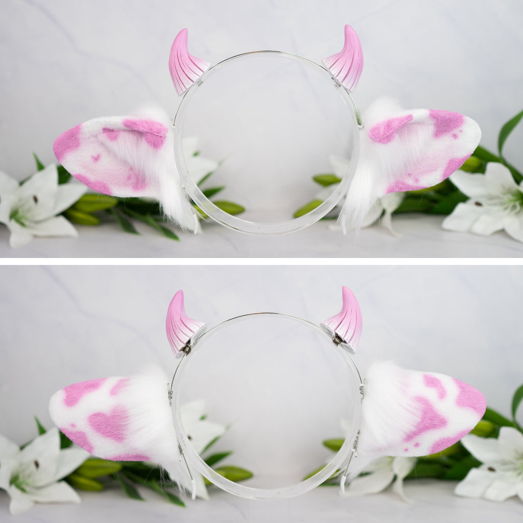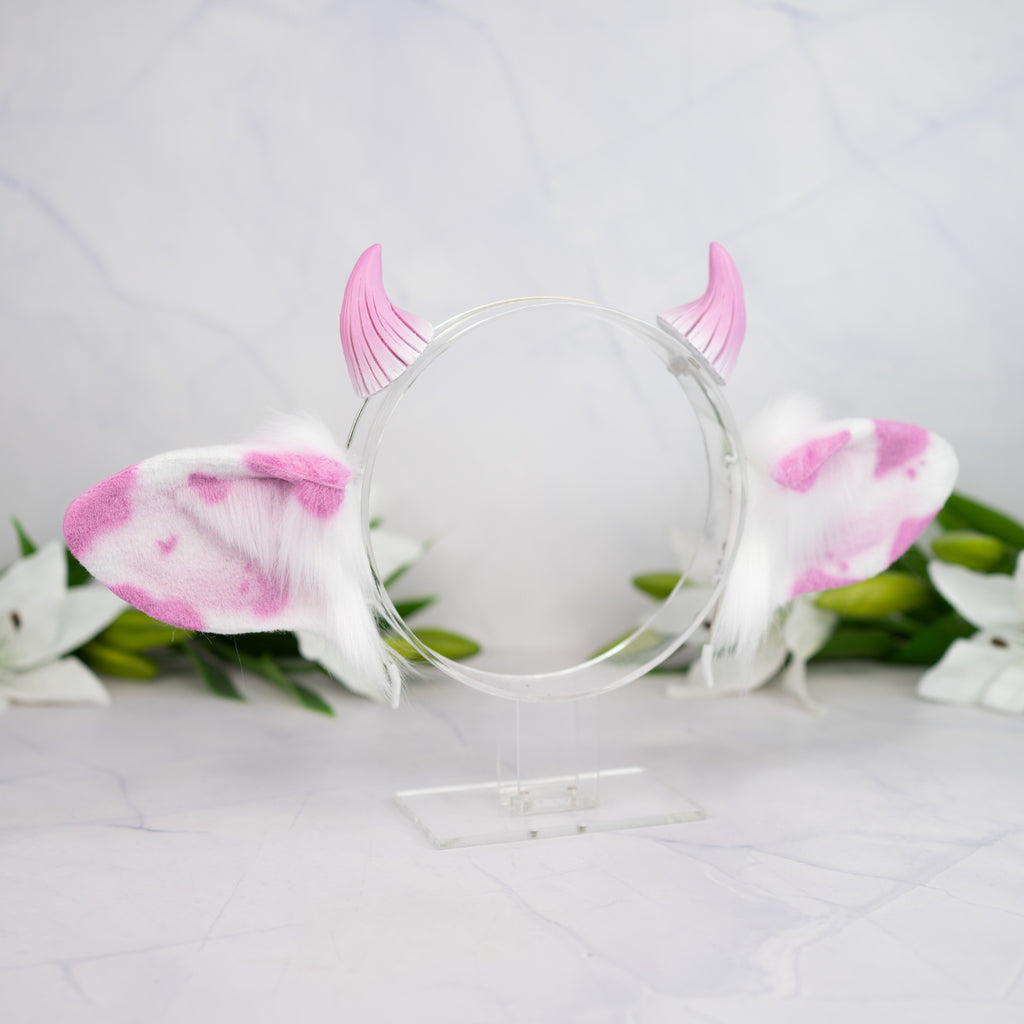 What is offered: A thin metal headband with a pair of faux fur cow ears in the color white/pink and small horns on clips
