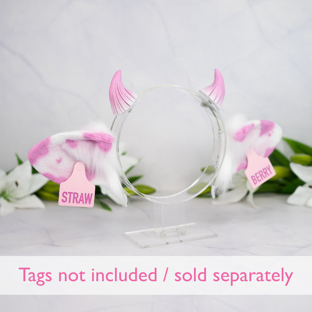 Handmade cow ears crafted from high-quality faux fur. Each pair is carefully trimmed and airbrushed by hand. The ears are attached to a thin metal headband (one size, adult) and can be moved up and down on the headband. They are fully wired and therefore poseable.