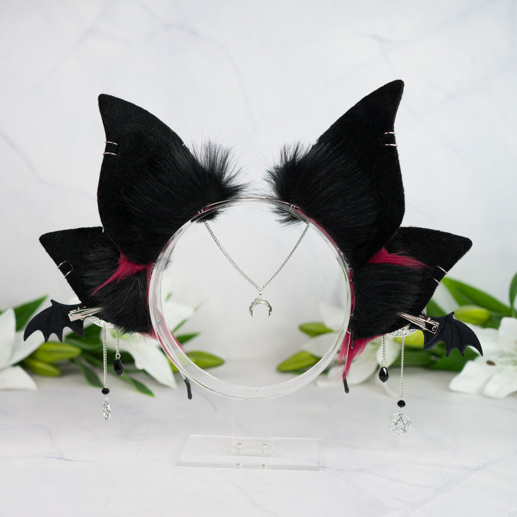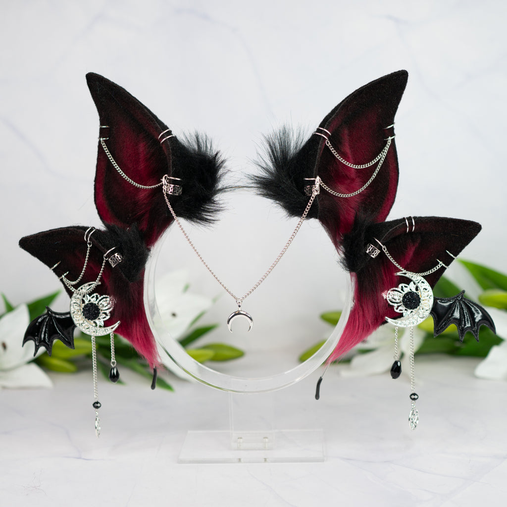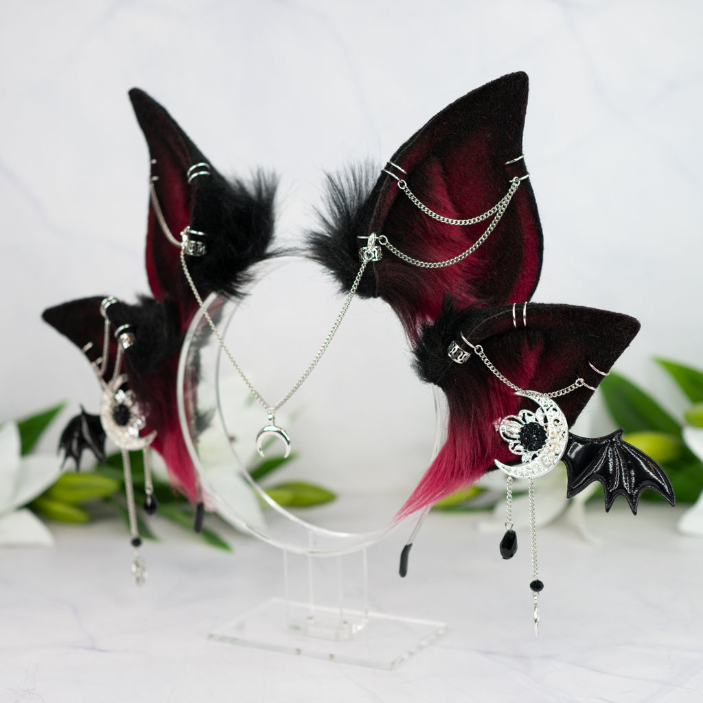 What is offered: A thin metal headband with a pair of faux fur bat goddess ears in the color wine/black with silver piercings and chains, a removable forehead chain and removable wing clips