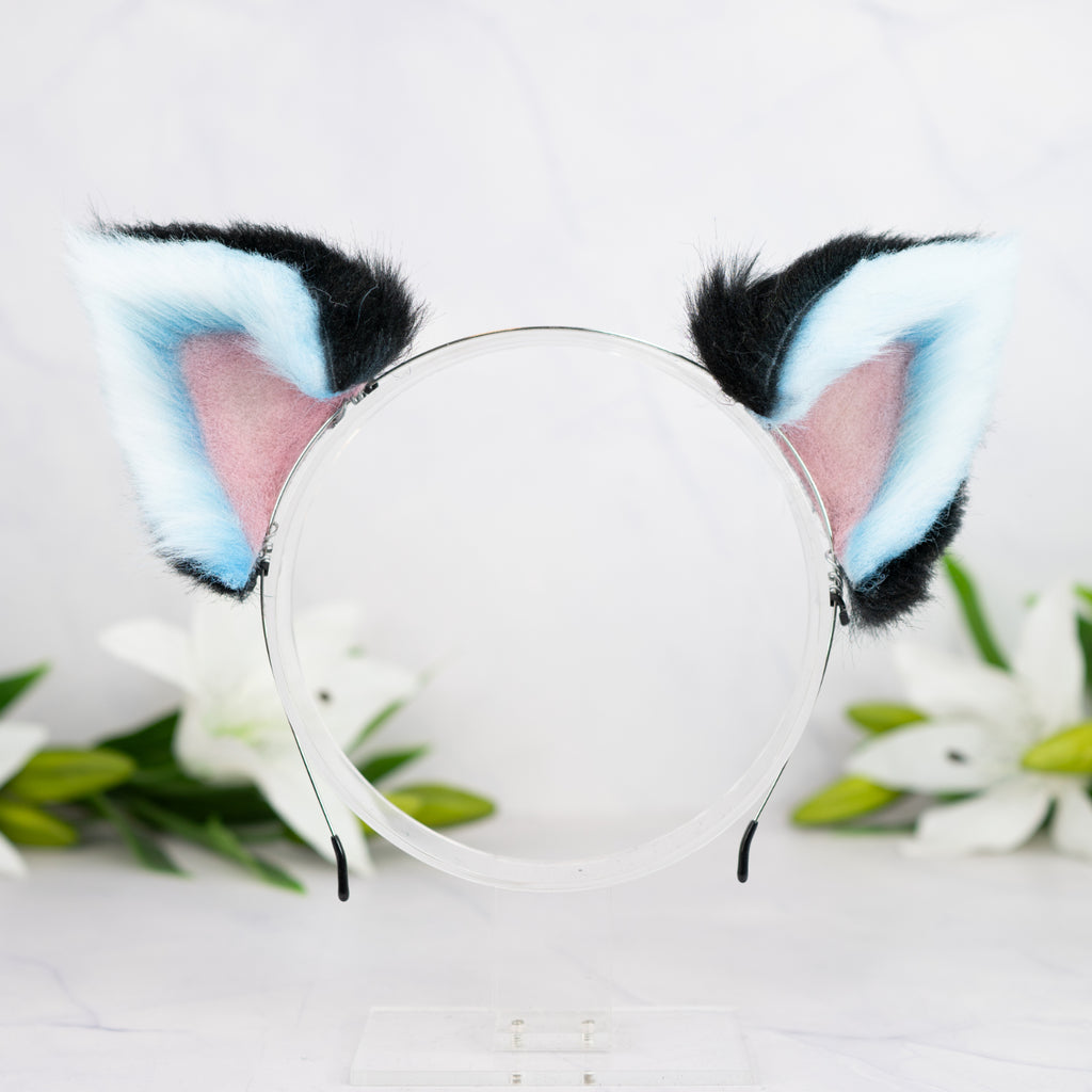 What is offered: A thin metal headband with a pair of faux fur derpy tiger inspired ears in the color black/white/blue/pink