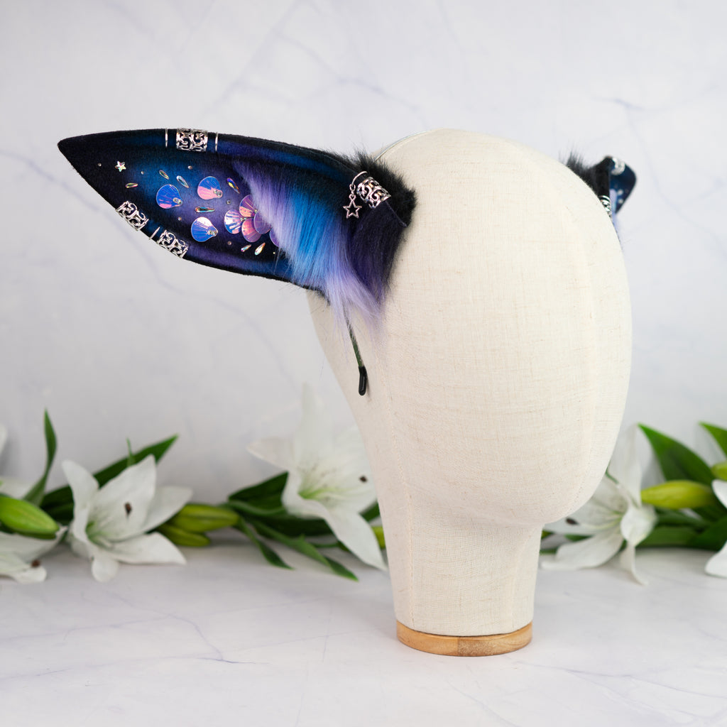 What is offered: A thin metal headband with a pair of faux fur dragon ears in the color black/purple/blue with silver piercings, rhinestones and scales