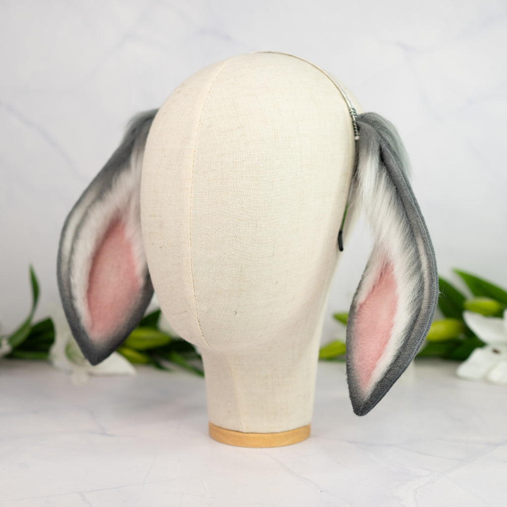 What is offered: A thin metal headband with a pair of faux fur lop bunny ears in the color grey/white/pink
