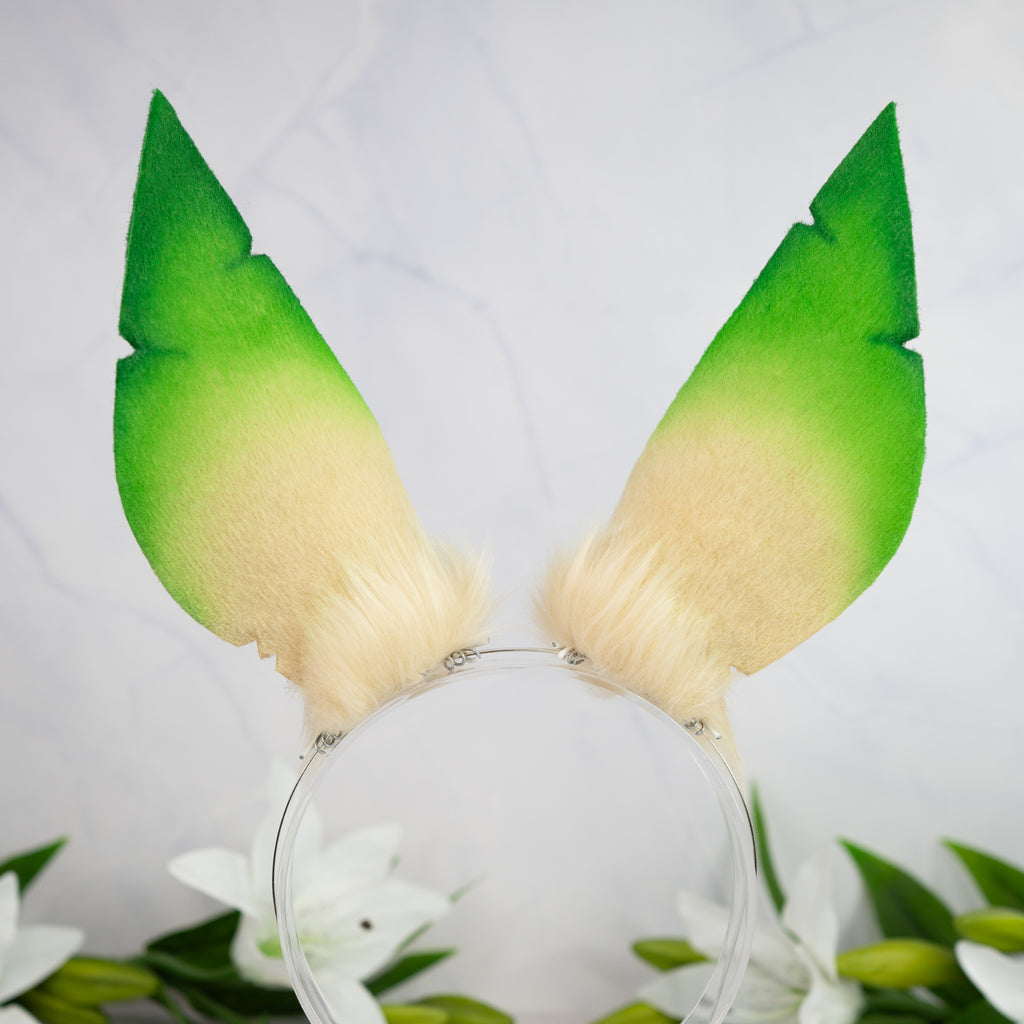 Handmade Leafeon inspired ears made from high quality faux fur. They have been trimmed and airbrushed. The ears are attached to a thin metal headband (onesize adult). They can be moved up and down on the headband and are fully wired and therefore poseable.