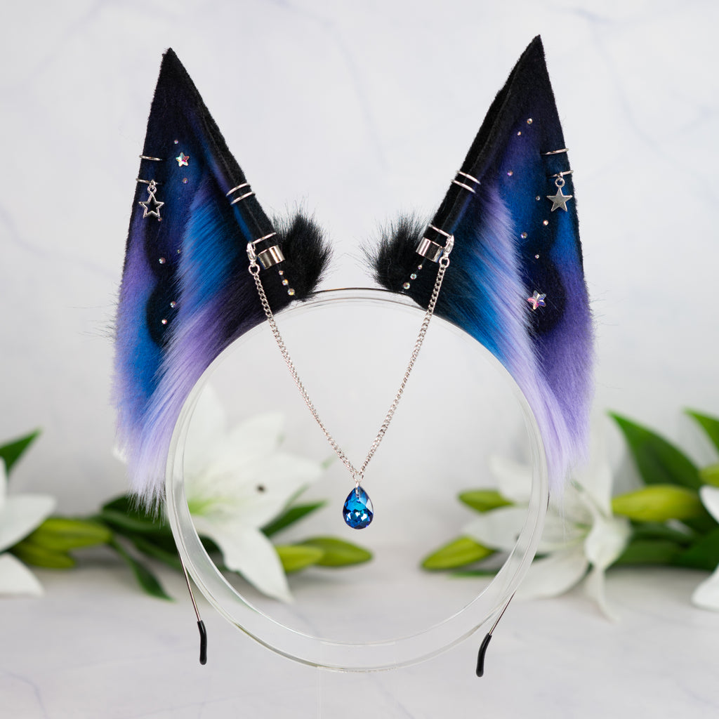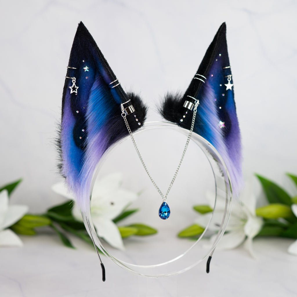 What is offered: A thin metal headband with a pair of faux fur fox ears in the color black/purple/blue with rhinestones, silver piercings and a removable forehead chain
