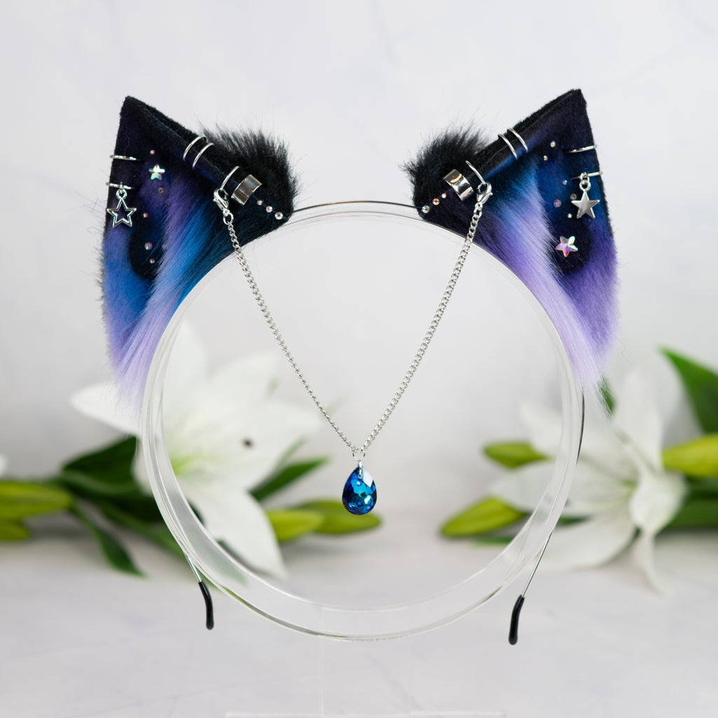 What is offered: A thin metal headband with a pair of faux fur kitten ears in the color black/purple/blue with rhinestones, silver piercings and a removable forehead chain