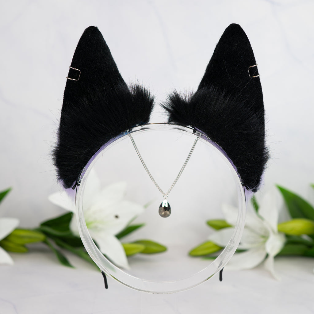 What is offered: A thin metal headband with a pair of faux fur wolf ears in the color black/purple/blue with rhinestones, silver piercings and a removable forehead chain