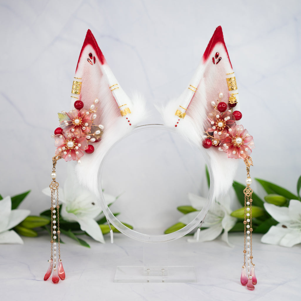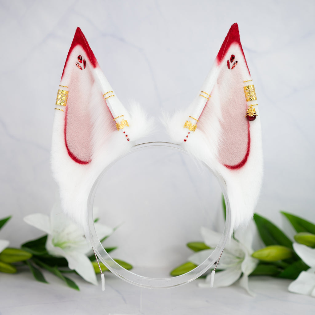 What is offered: A thin metal headband with a pair of faux fur kitsune ears in the color white/red with gold piercings, rhinestones and removable clip accessories