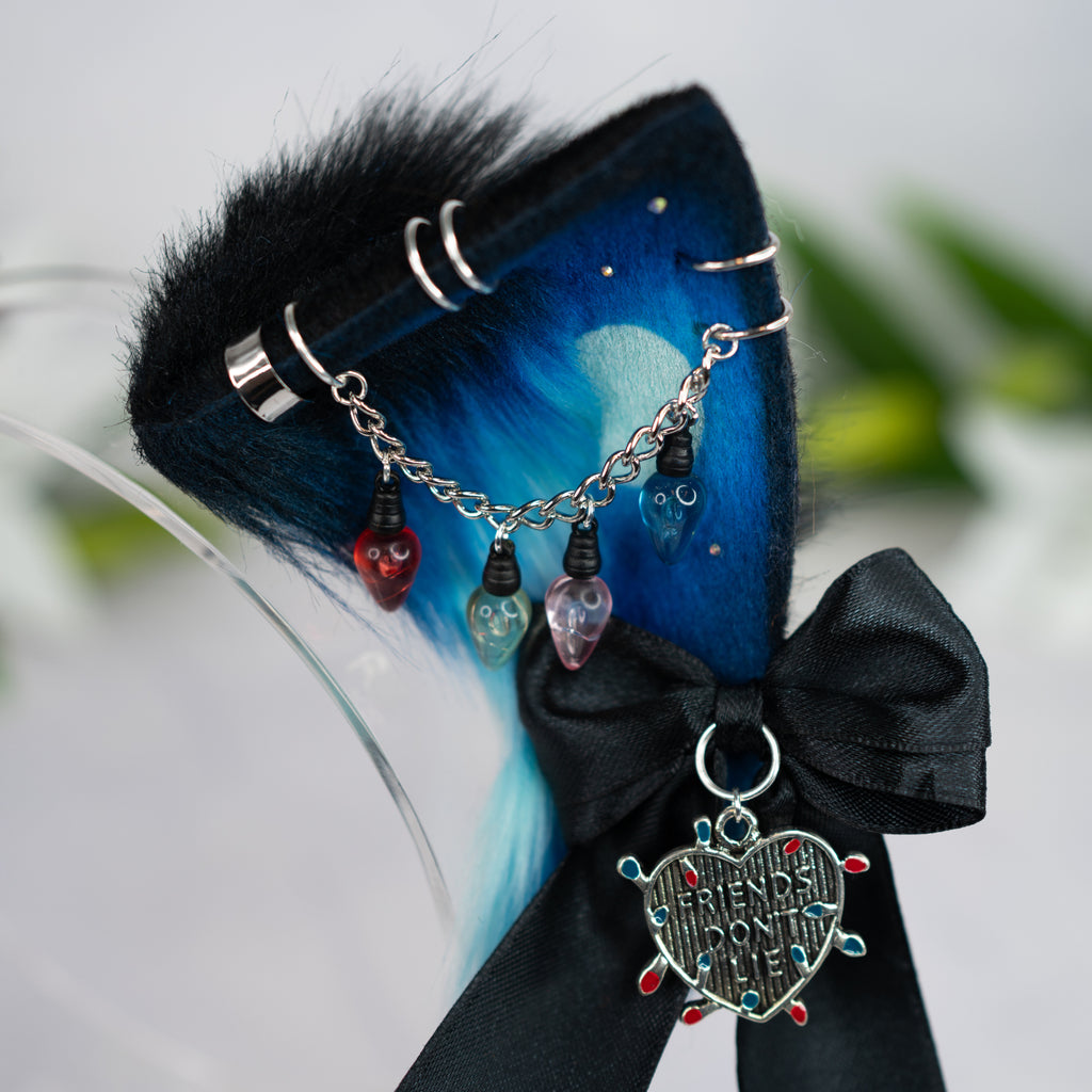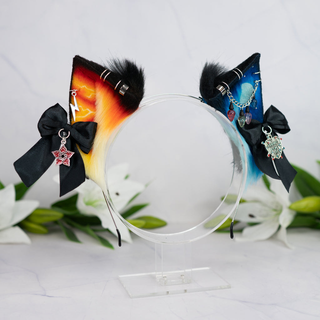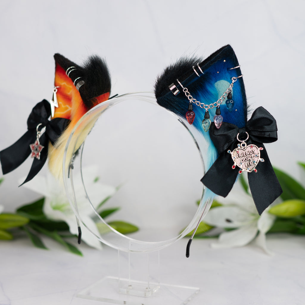 What is offered: A thin metal headband with a pair of faux fur cat ears in the color yellow/orange/red/blue/black with silver stars and piercings and removable bows
