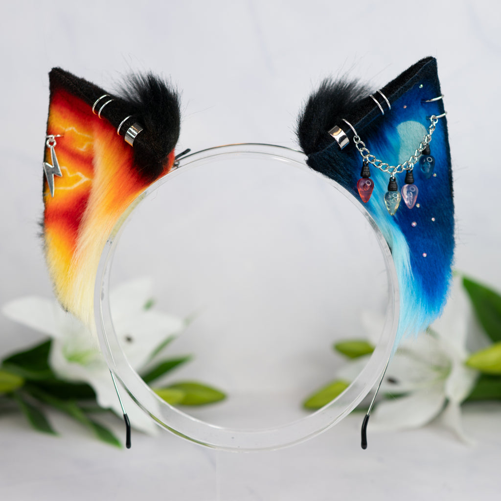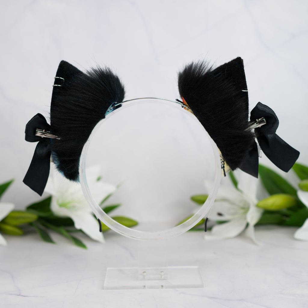 Handmade cat ears made from high quality faux fur. They have been trimmed and airbrushed. The ears are attached to a thin metal headband (onesize adult). They can be moved up and down on the headband and are fully wired and therefore poseable. Removable bows are included.